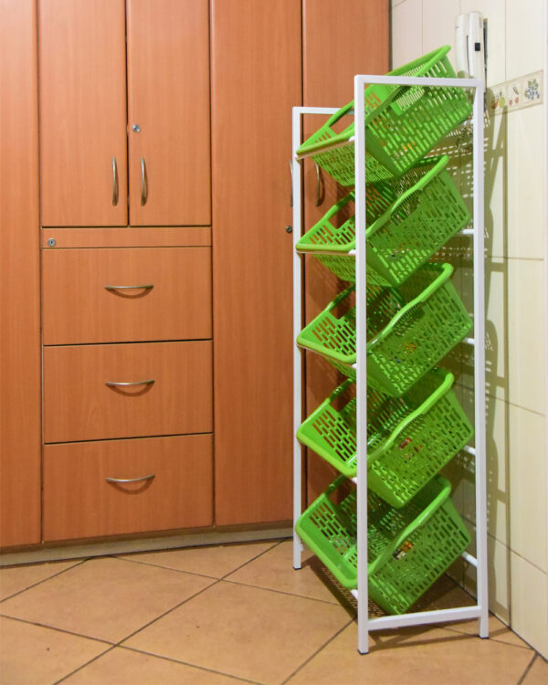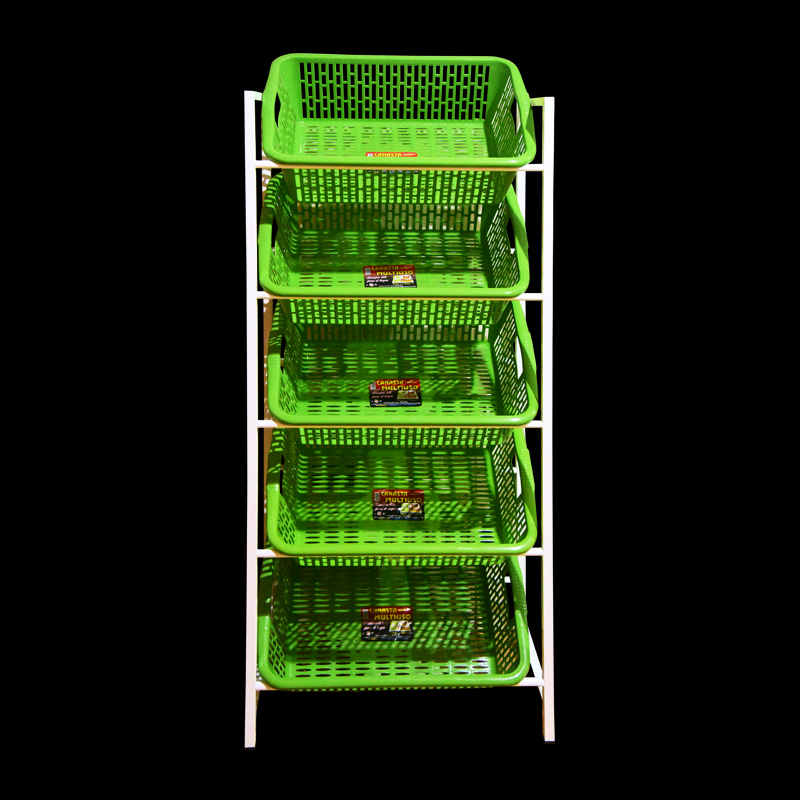 ORGANIZADOR DE FRUTAS Y VERDURAS ,Estructura muy resistente de acero cubierto con pintura en polvo electrostático blanco y 05 canastillas de plástico, disponible con ruedas y sin ruedas.