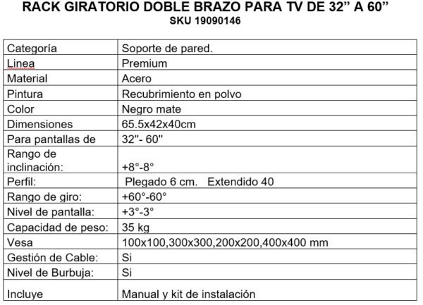RACK GIRATORIO DOBLE BRAZO PARA TV DE 32″ A 60″